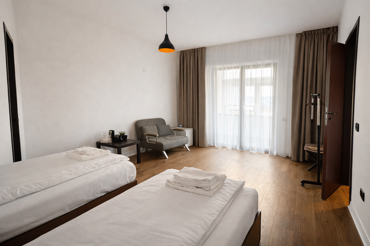De asemenea, dispunem de apartamente spațioase, potrivite pentru familii sau grupuri mici, cu o capacitate de 3 până la 4 persoane. Acestea oferă mai mult spațiu și intimitate, fiind alegerea perfectă pentru cei care își doresc un plus de confort.